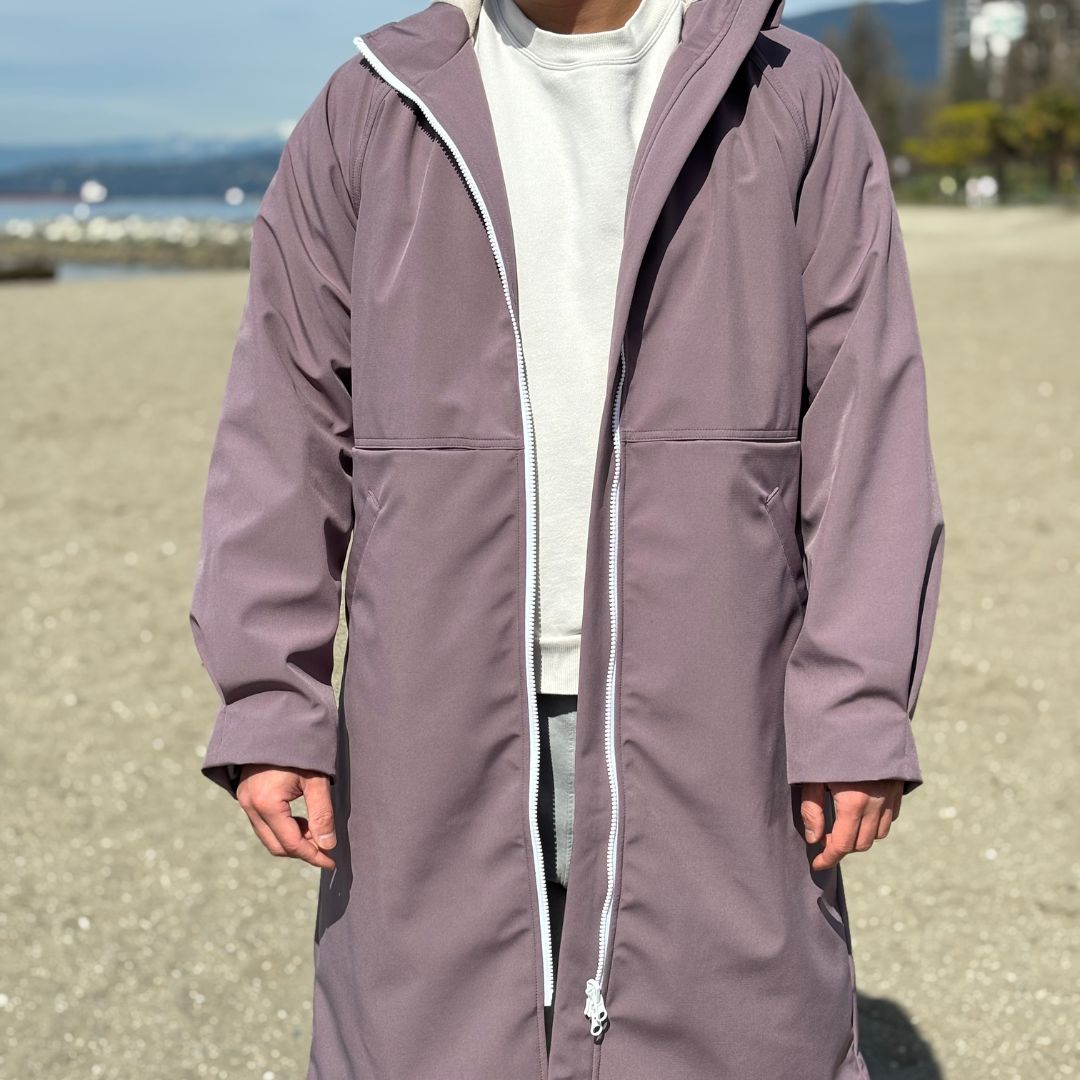 Our swim parkas are made in Vancouver, Canada, by our experienced manufacturing partner. We use long-lasting high-quality recycled polyester, and polyester blended with a small amount of spandex (shape retention).